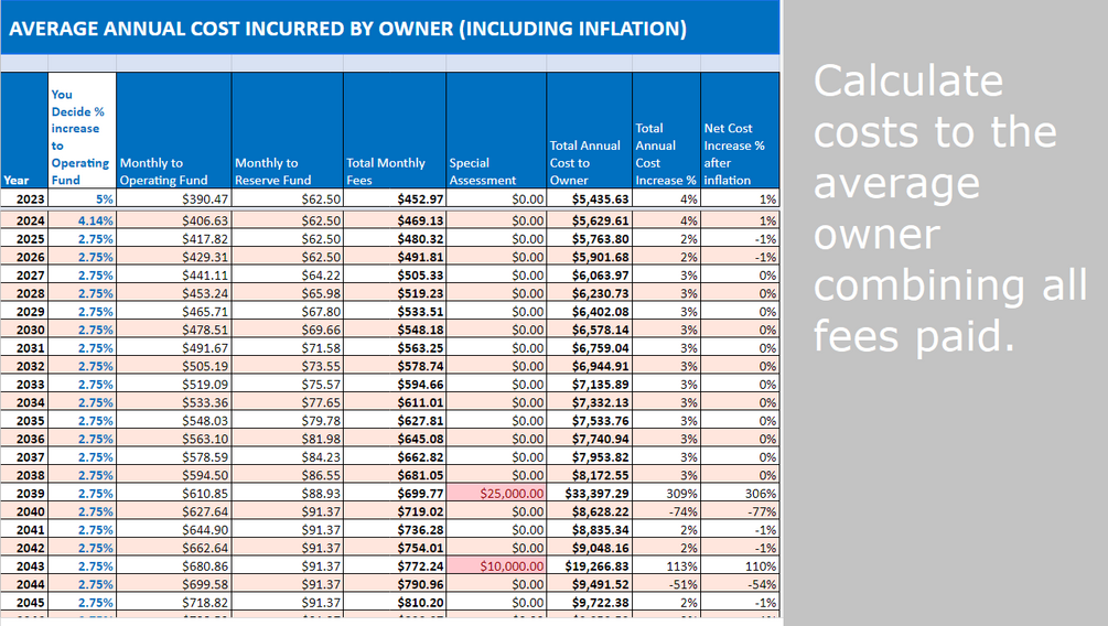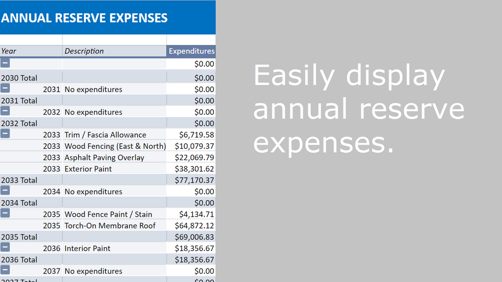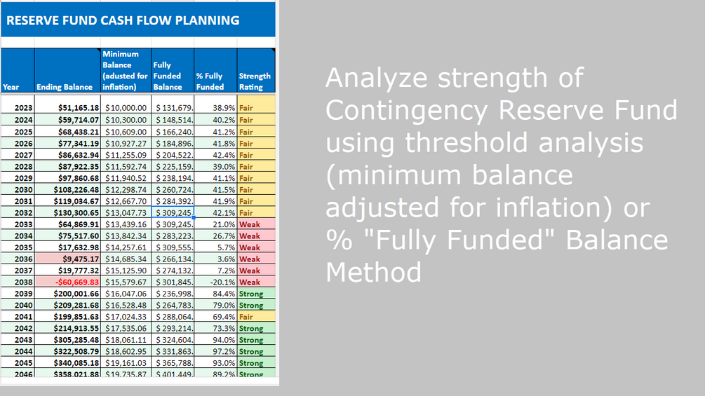 - Analyze strength of Contingency Reserve Fund Ending Balance using color-coded minimum balance threshold or Fully Funded Balance method (% Funded)